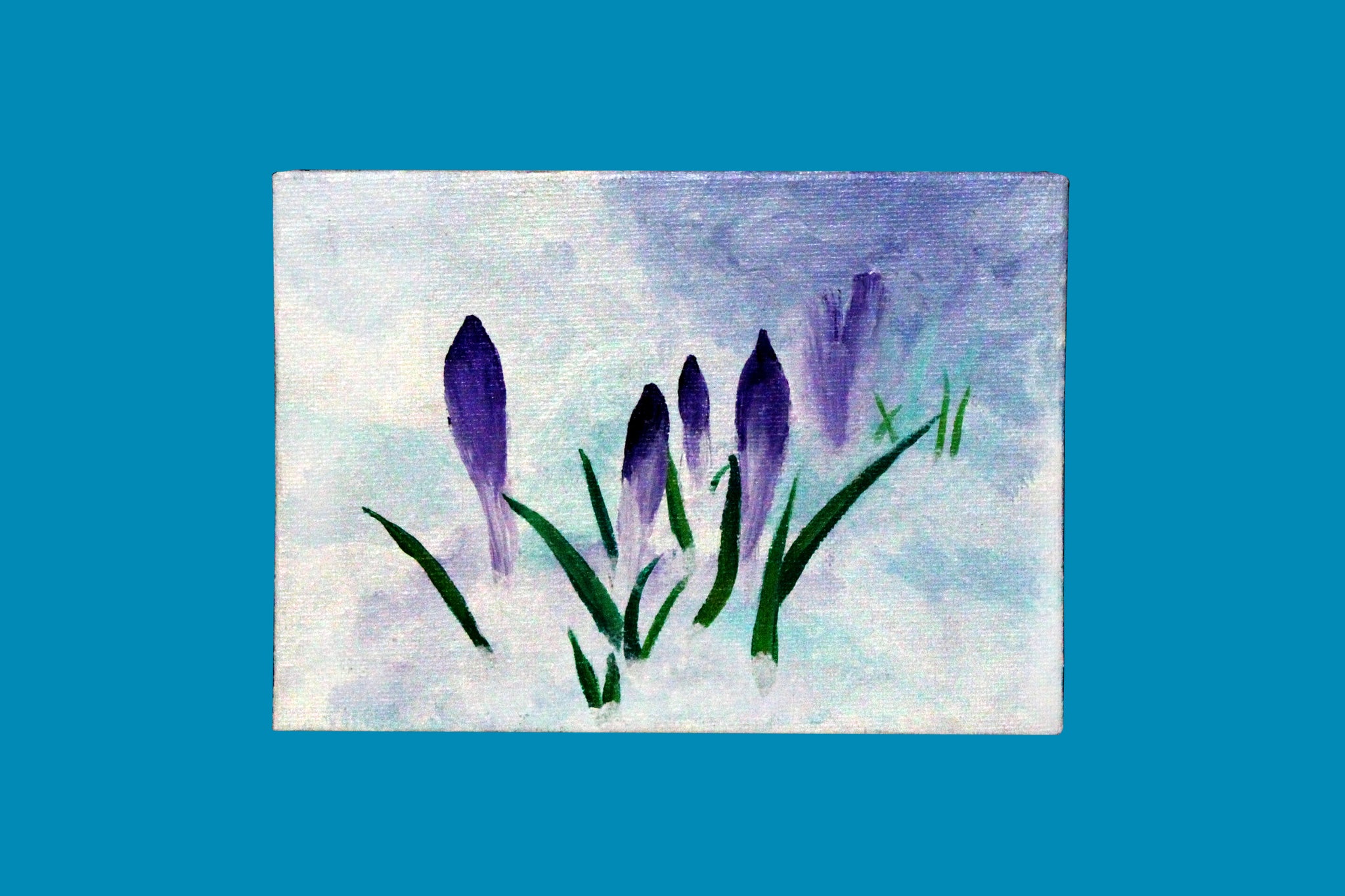 Original miniature 5" by 7" acrylic painting of slightly abstract purple flowers poking through a snowy cover. This piece would easily fit nicely inside a frame. All originals are sealed with varnish and signed on the back.